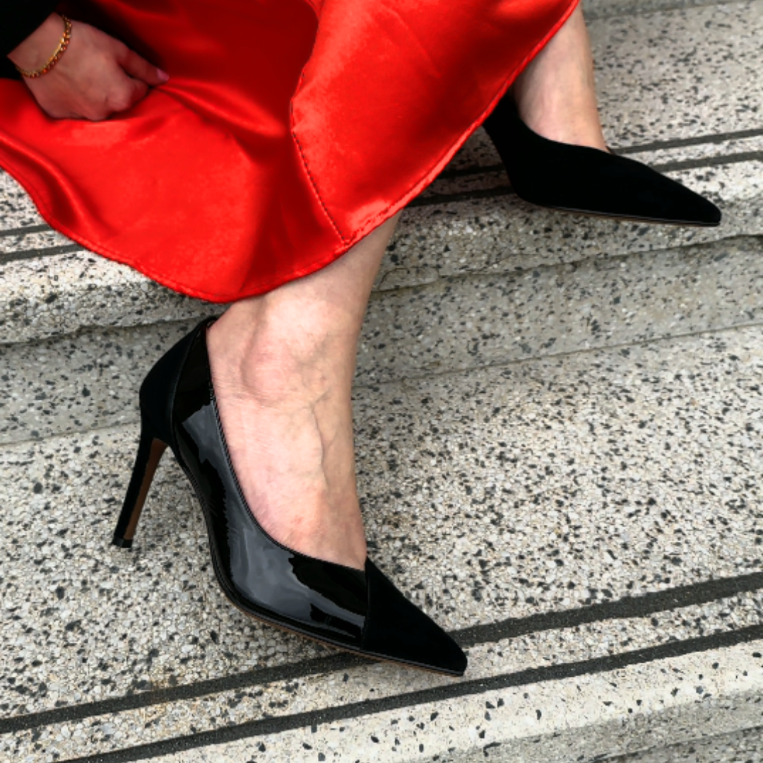 The Verona Pump blends timeless elegance with modern detail. Crafted in smooth leather and soft suede, its two-tone design and 8cm heel make it the perfect choice for both office polish and evening sophistication.