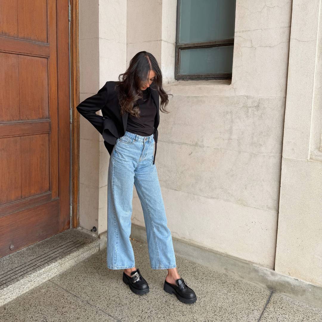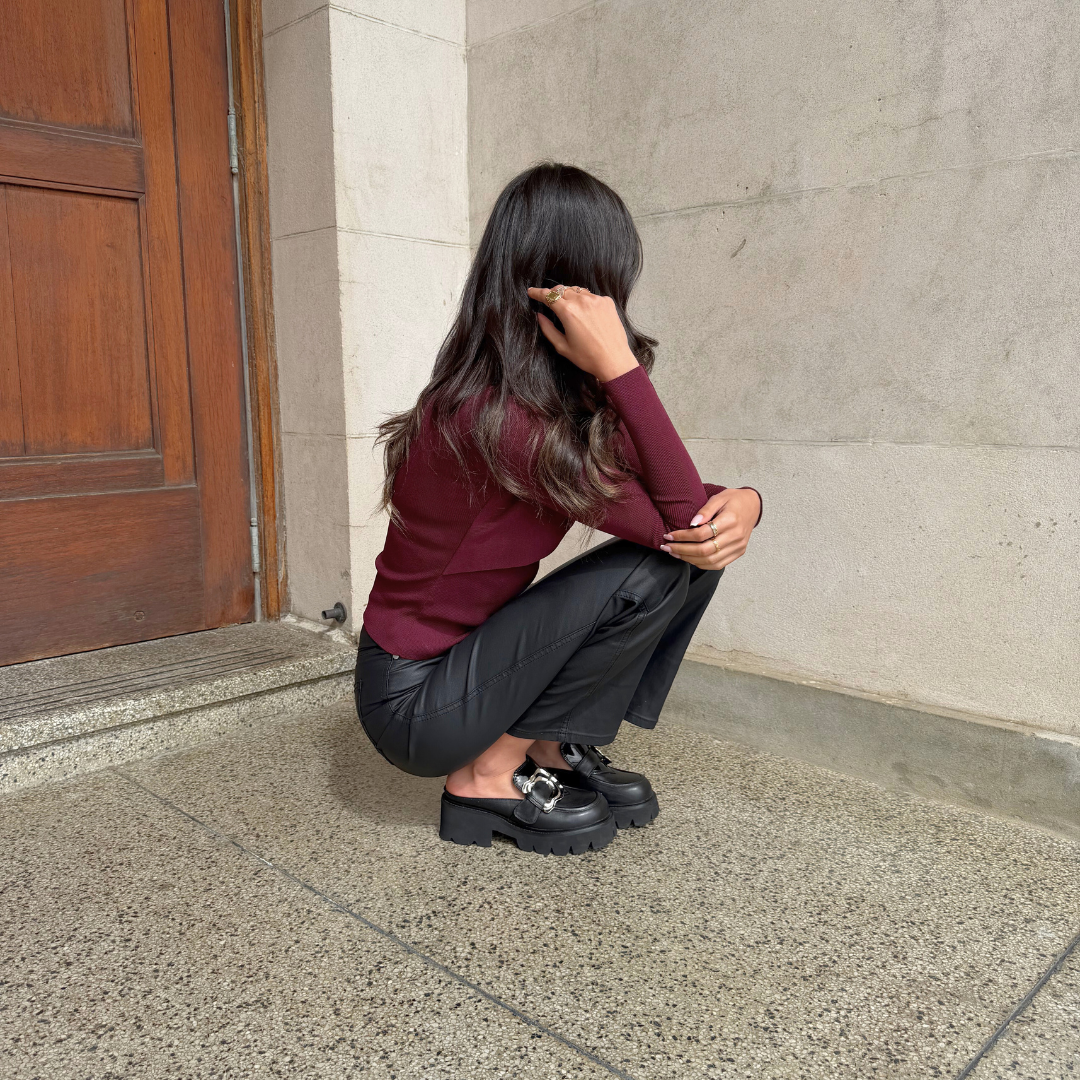 Crafted in black leather and grounded with a lug sole for stability, it adds height without pressure and attitude without effort.