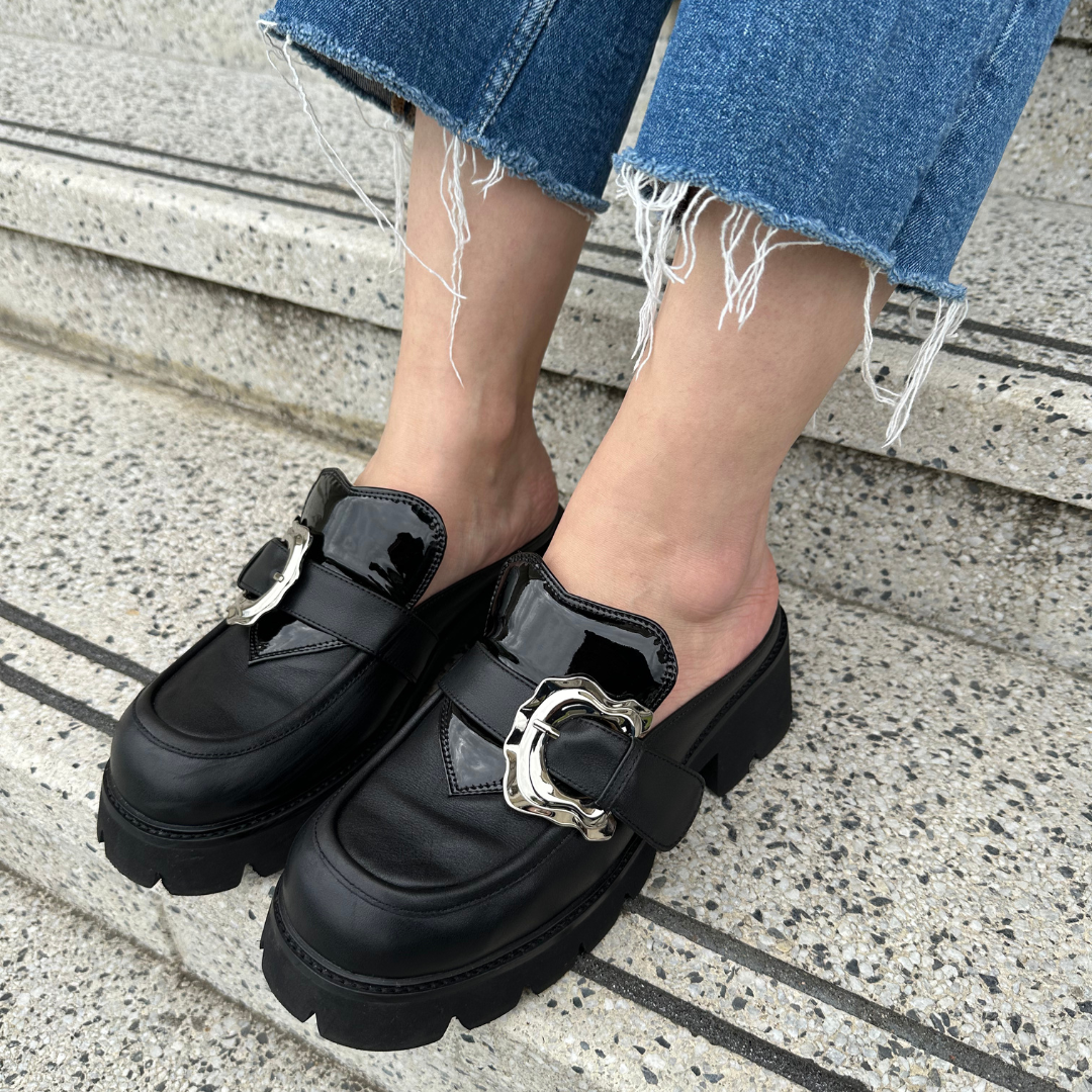 Accommodates wide feet. PREORDER- ETA 3 WEEKS FROM ORDER. Bold from every angle. The Ryder Mule is a statement slip-on built for comfort and edge. Designed with a chunky platform sole, oversized sculpted buckle, and finished with a high-gloss patent leather heart detail across the front, it's the kind of shoe that speaks for itself. Crafted in black leather and grounded with a lug sole for stability, it adds height without pressure and attitude without effort. Ryder brings edge and ease to your wardrobe. Whether styled with denim, tailored trousers or a coat-and-sock combo, this is the pair you’ll reach...