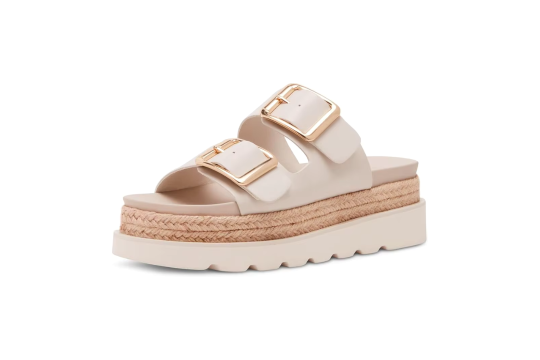 The Solea Slide is a modern take on effortless summer style. Featuring wide double straps finished with oversized gold buckles, this slide pairs laid-back ease with a touch of polish. The cushioned insole, espadrille-wrapped platform, and chunky sole bring comfort and height, perfect for elevating everyday outfits from denim to dresses.